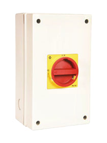 Plastic Enclosures, Protection IP66, totally insulated, knock-outs Handle red, in the OFF-position lockable with padlocks, Plate Backing grey Dimensions (w x h x d): 100mm x 190mm X 93mm Switch interlocked with lid to prevent opening in ON position