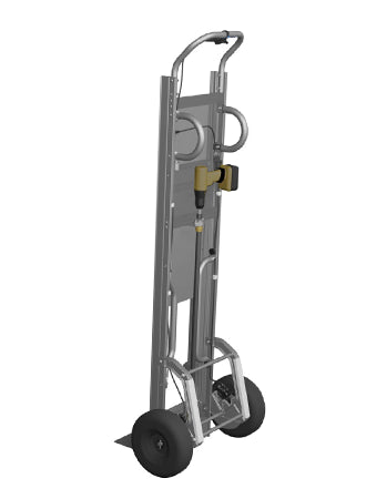 Pneumatic wheels, hydraulic disc brakes, and slide rails ensure the dolly can cross rough terrain and descend stairs.